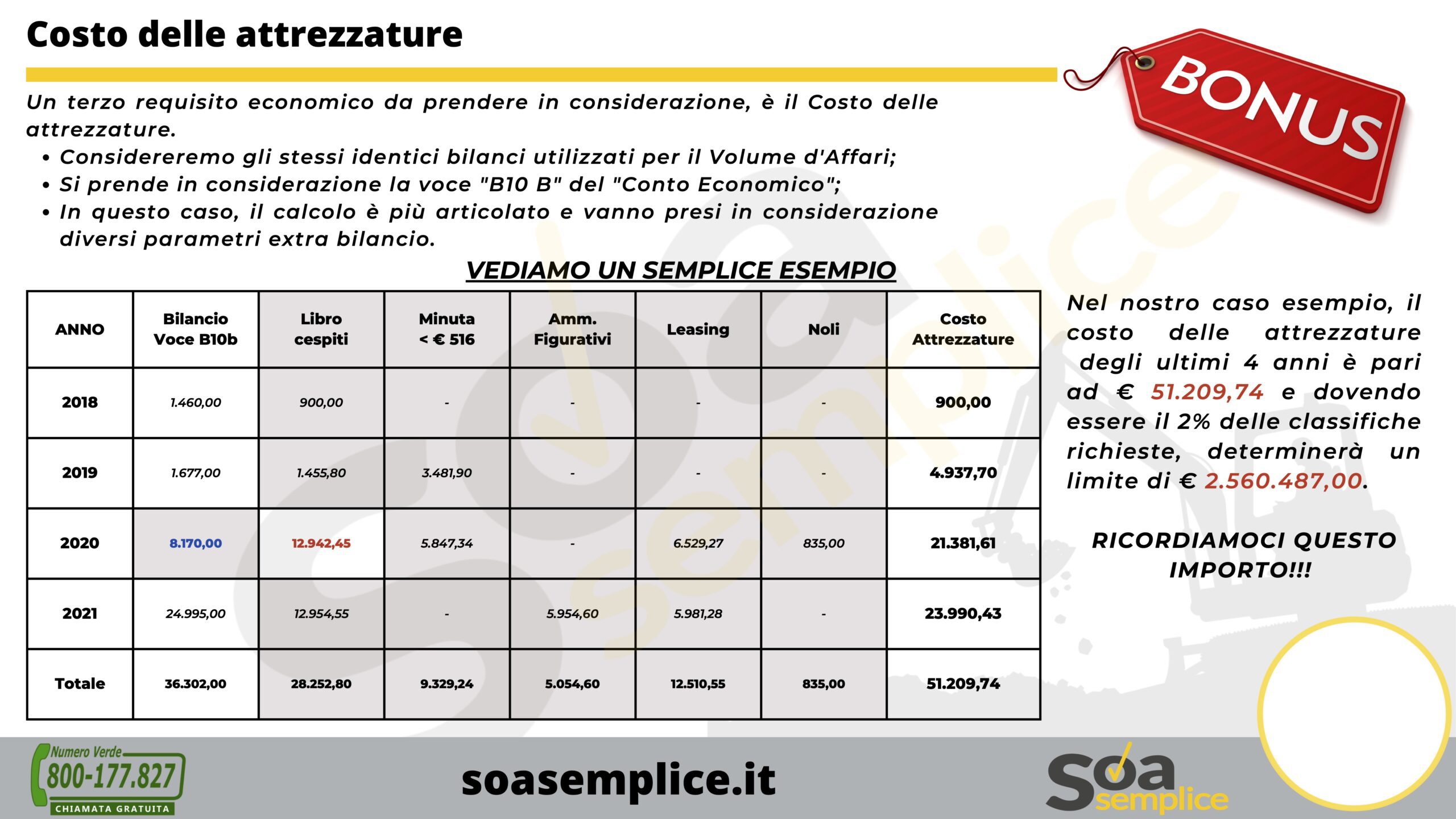 Anche qui facciamo un calcolo simile a quello del costo del personale: Costo delle attrezzature X 100 / 2. Il totale è di 2.560.487,00€.